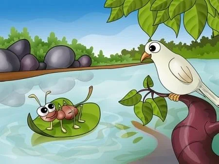 Once a stream ran through a green field. There lived an ant beside the stream. One day the ant went to the stream to drink water. While drinking water, suddenly the ant fell into the running water. ile "Help! Help!" shouted the ant. But no one heard him. A dove was sitting on a tree near the stream. He saw the miserable condition of the ant and felt pity. Very quickly he broke off a wide piece of grass. He flew over the stream and dropped the grass right before the ant. The little ant climbed onto the grass. Soon the grass struck in some reeds and the ant climbed onto the bank. What a lucky escape! After a few days the ant was looking for food beside the stream. He stood still hearing the cooing of a dove. He saw that it was the same dove that saved his life. He was very happy to see the dove and wanted to show his gratefulness by waving but of no use. Then to his utter horror he found a boy carying a bow and an arrow. The boy quietly drew the bow and aimed at the dove. Just at that moment the ant bit very seriously on the boy's leg. So, the boy's aim failed and it hit a branch of the tree. The dove flapped her wings and flew off in a hurry. The boy bent down to look. There was a tiny red mark on his leg. And the ant? He was no where to be seen!